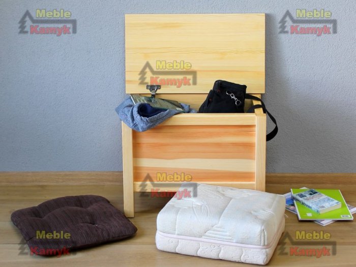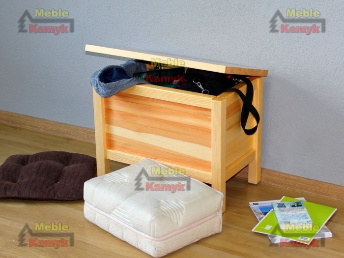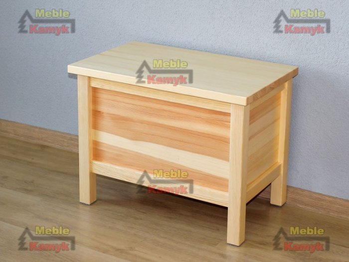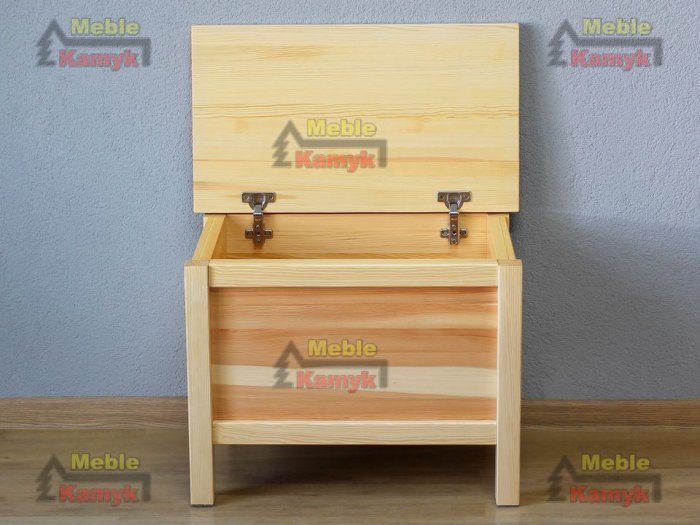 Kufer z drewna sosnowego wykonany w nowoczesnej linii wzorniczej z konstrukcją wspartą na czterech słupkach.
